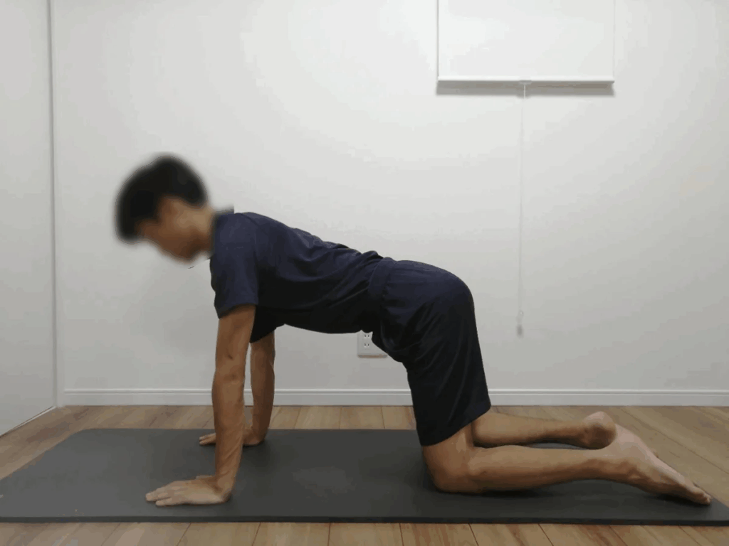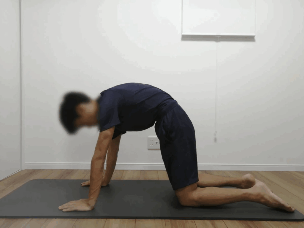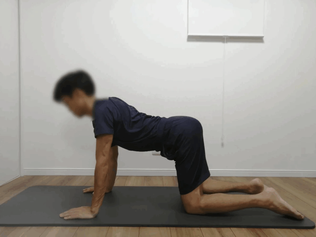 ① 1枚目の写真のように四つ這いの姿勢をします。手は肩の下、膝は股関節の下に置きます。