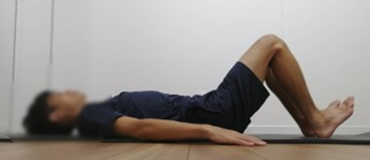 ① 仰向けになり膝を立てます。足の幅は腰幅で足首は上に反らせておきます。(1枚目の写真)